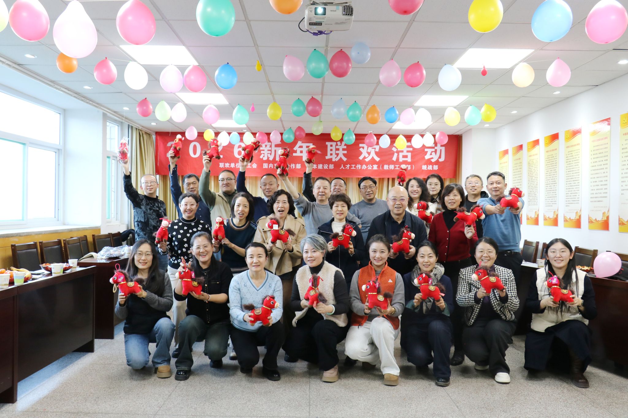 2026年1月6日下午,党委统战部、校工会、基本建设部、国内交流合作部、教师工作部(人才办公室)五个部门携手打造的新年联欢会热闹启幕。一曲欢快喜庆的开场舞《中华全家福》率先登场,红火的氛围瞬间点燃全场,暖意融融的现场笑语盈盈,处处洋溢着辞旧迎新的蓬勃朝气。
