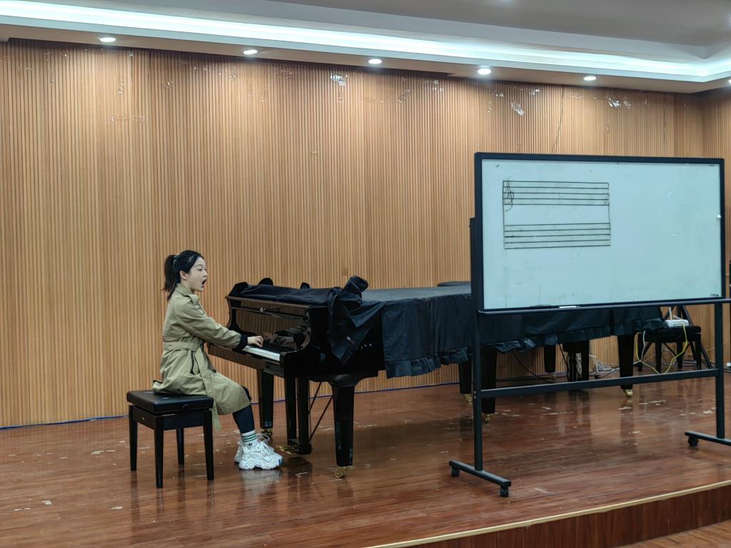 仪式后,合唱团指导教师王家乐带领大家从张口哼鸣等基本功着手,同时辅以发声方法进行训练,张鹏老师带领大家认识简谱中的各类符号,一步步将大家带入轻松而专注,沉静而又舒适的“艺术世界”,并对歌曲《天之大》女高二声部(第一页)进行了合唱排练,现场学习气氛非常热烈。